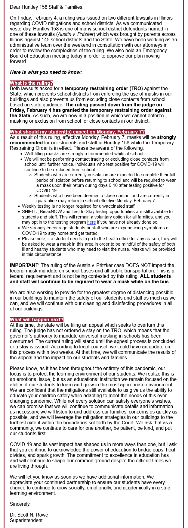 With Huntley District 158’s change to mask optional and removal of close-contact quarantining, we have heard from parents whose children are having issues regarding discrimination since this policy change.